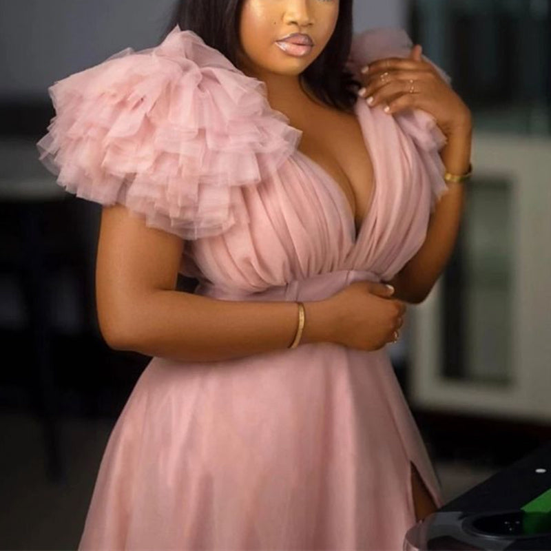Deep V neck dress with padded breasts.Pleated top and large flowers on the shoulders. The hem is a split style, composed of tulle and a layer of inner lining for a sexy, elegant look.