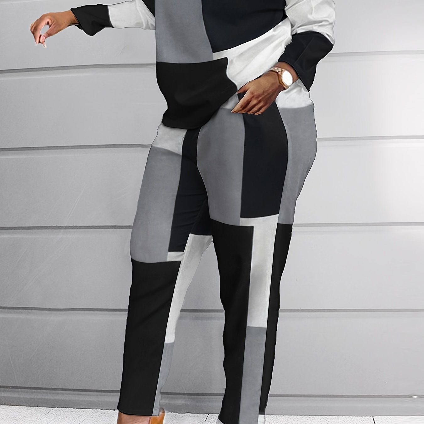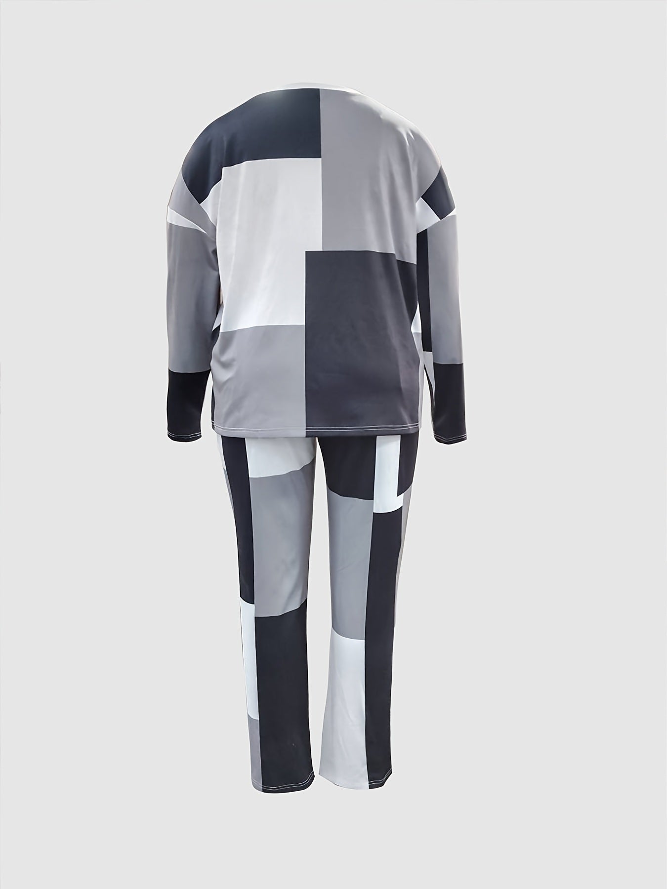 Make a Statement in Comfort: Plus Size Color Block Long Sleeve Top & Pants Set