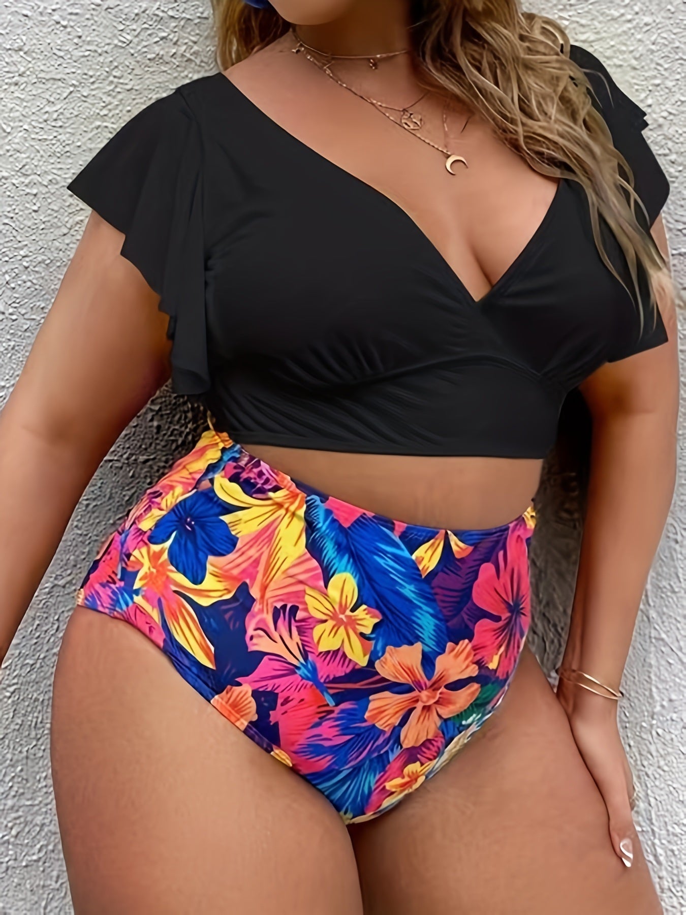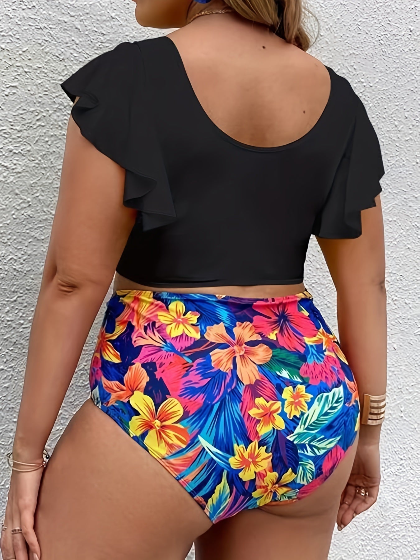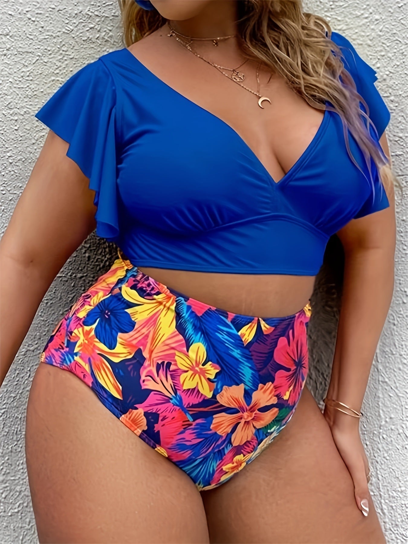Plus Size Colorblock Tropical Print Bikini Set; Women's Plus Ruffle Sleeve High Waist Boho Swimsuit Set Bathing Suit Set