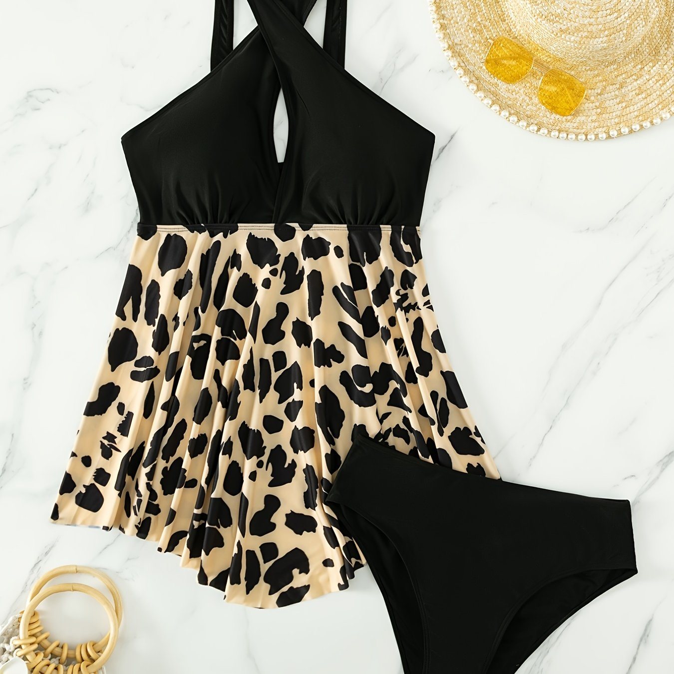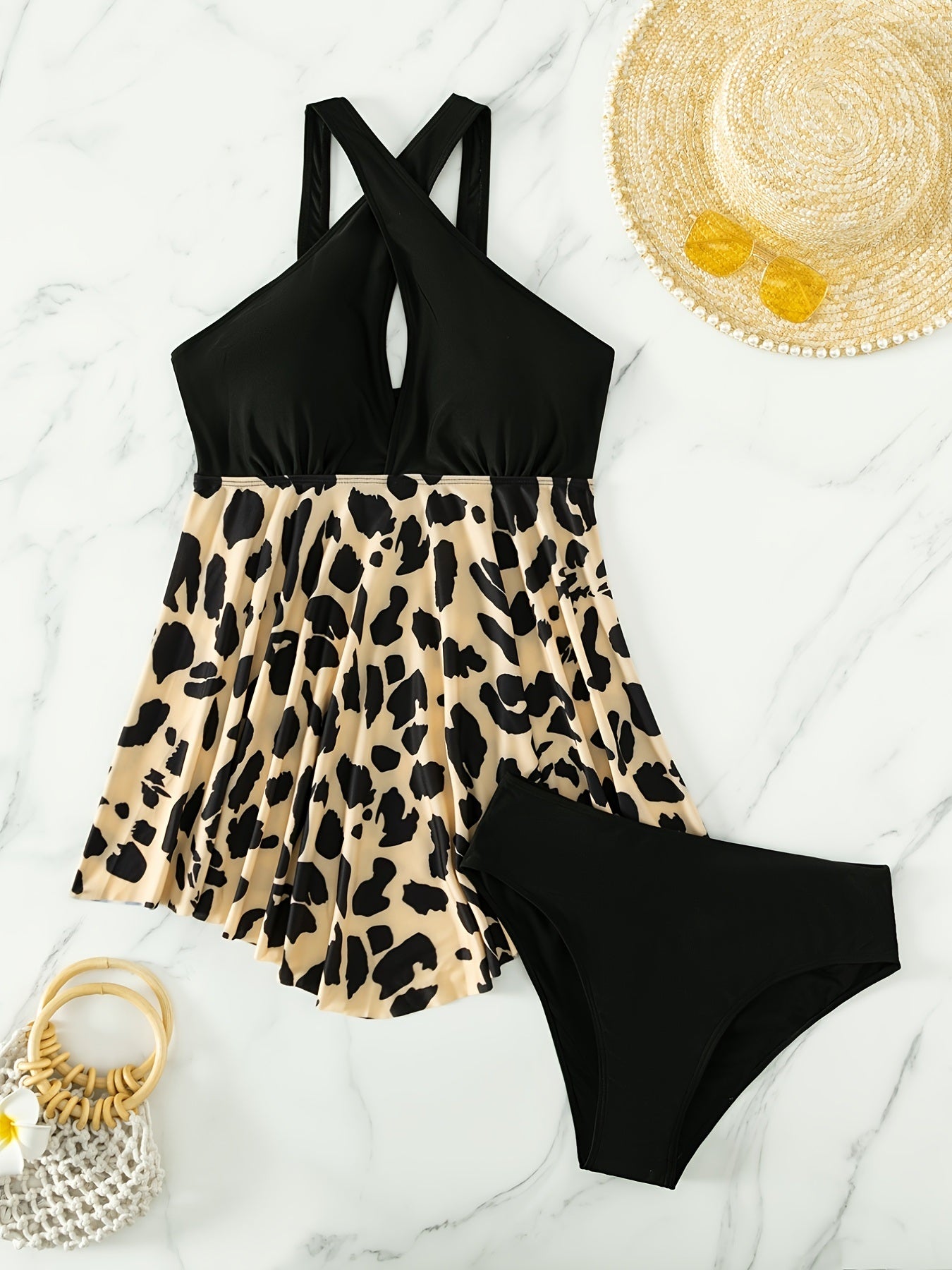 Plus Size Criss Cross Neck Leopard Print Bikini Set