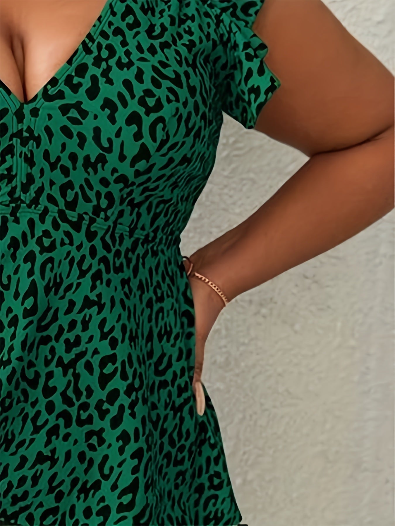 Plus Size Leopard Print Ruffle Trim Bikini Set; Women's Plus High Stretch Vacation Swimsuit Set