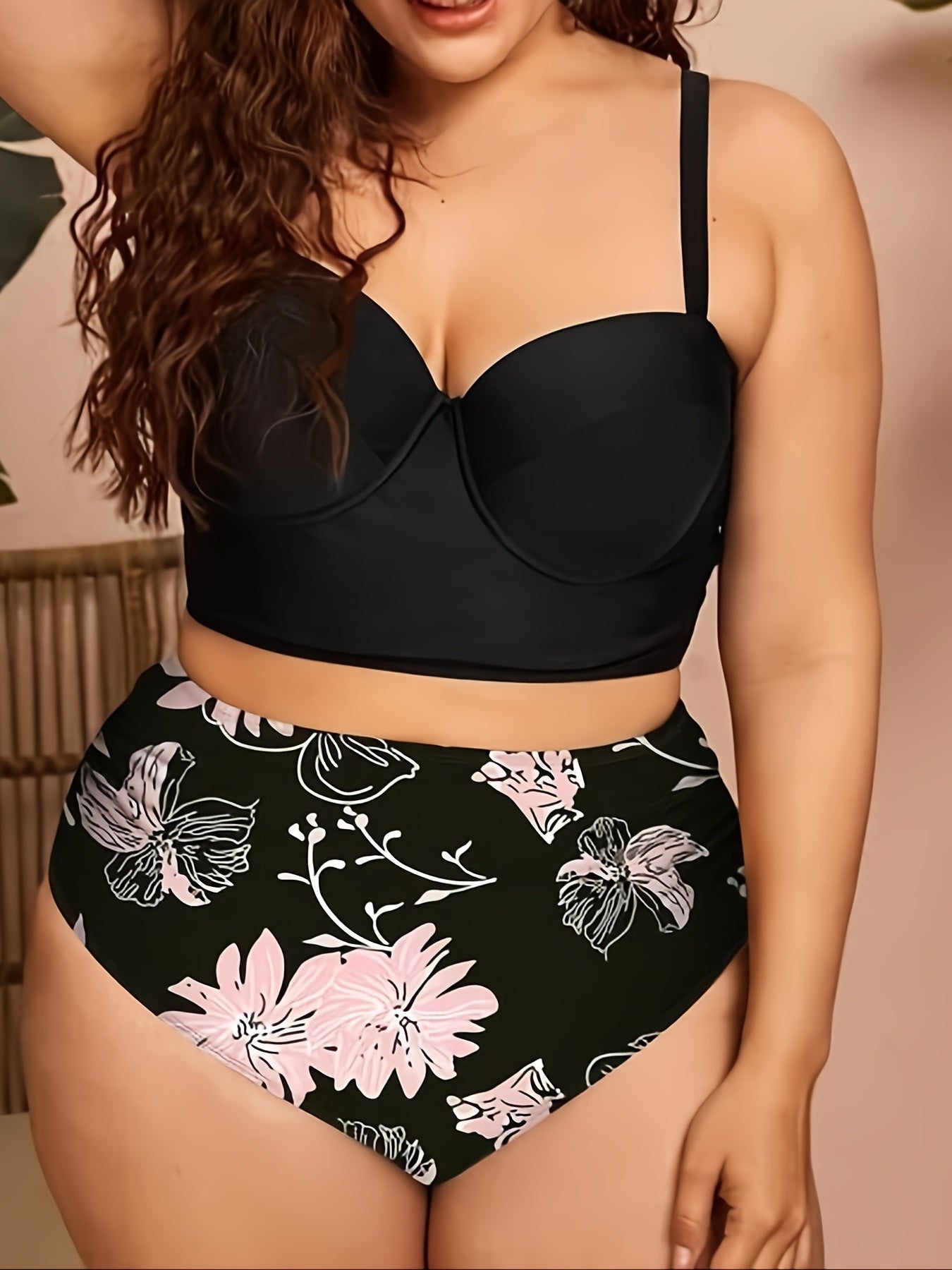 Embrace sunshine and summer style with our Plus Size Sunflower Print Swimsuit Set. This charming two-piece features a classic solid cami top paired with vibrant sunflower print pants, creating a look that's both playful and flattering for all body types.