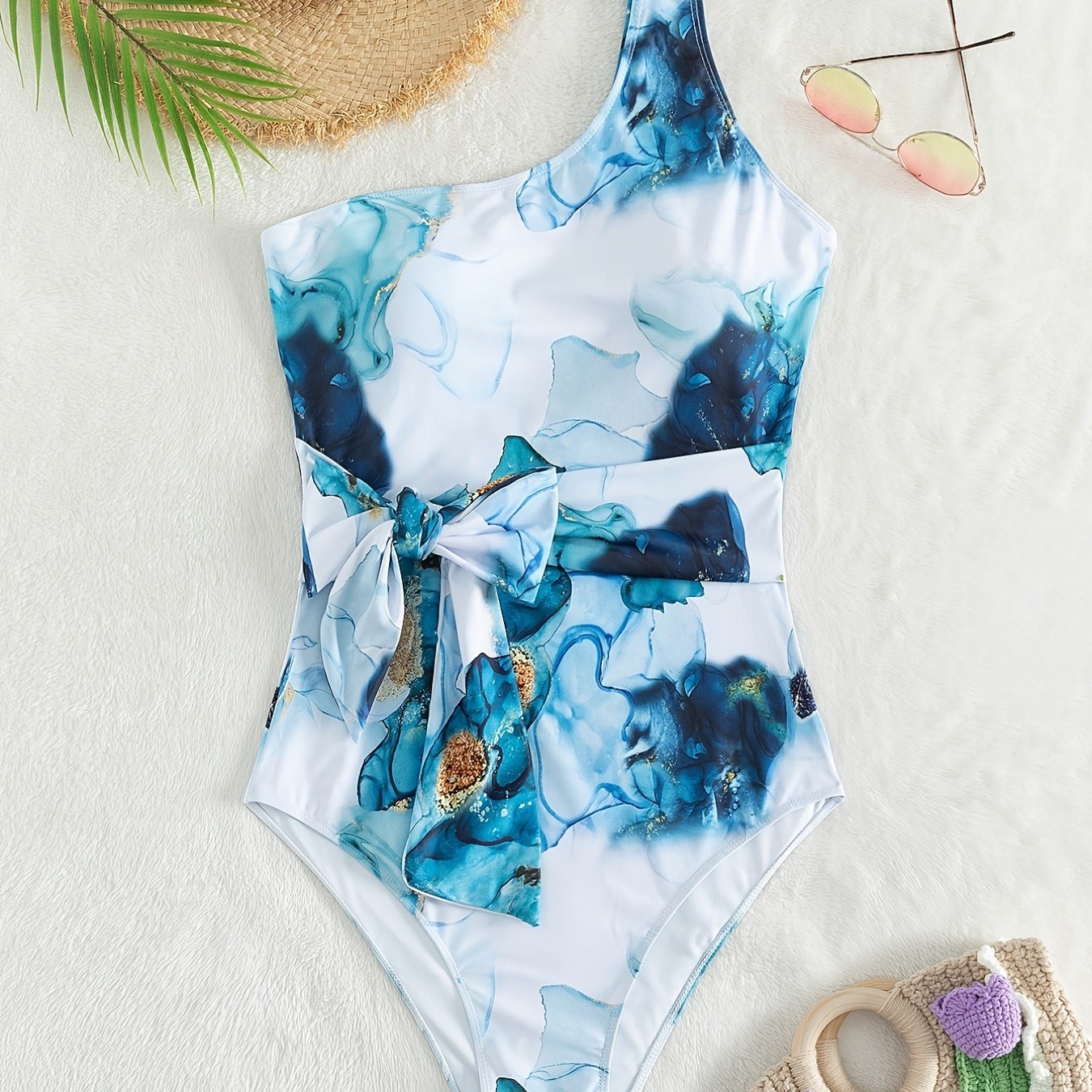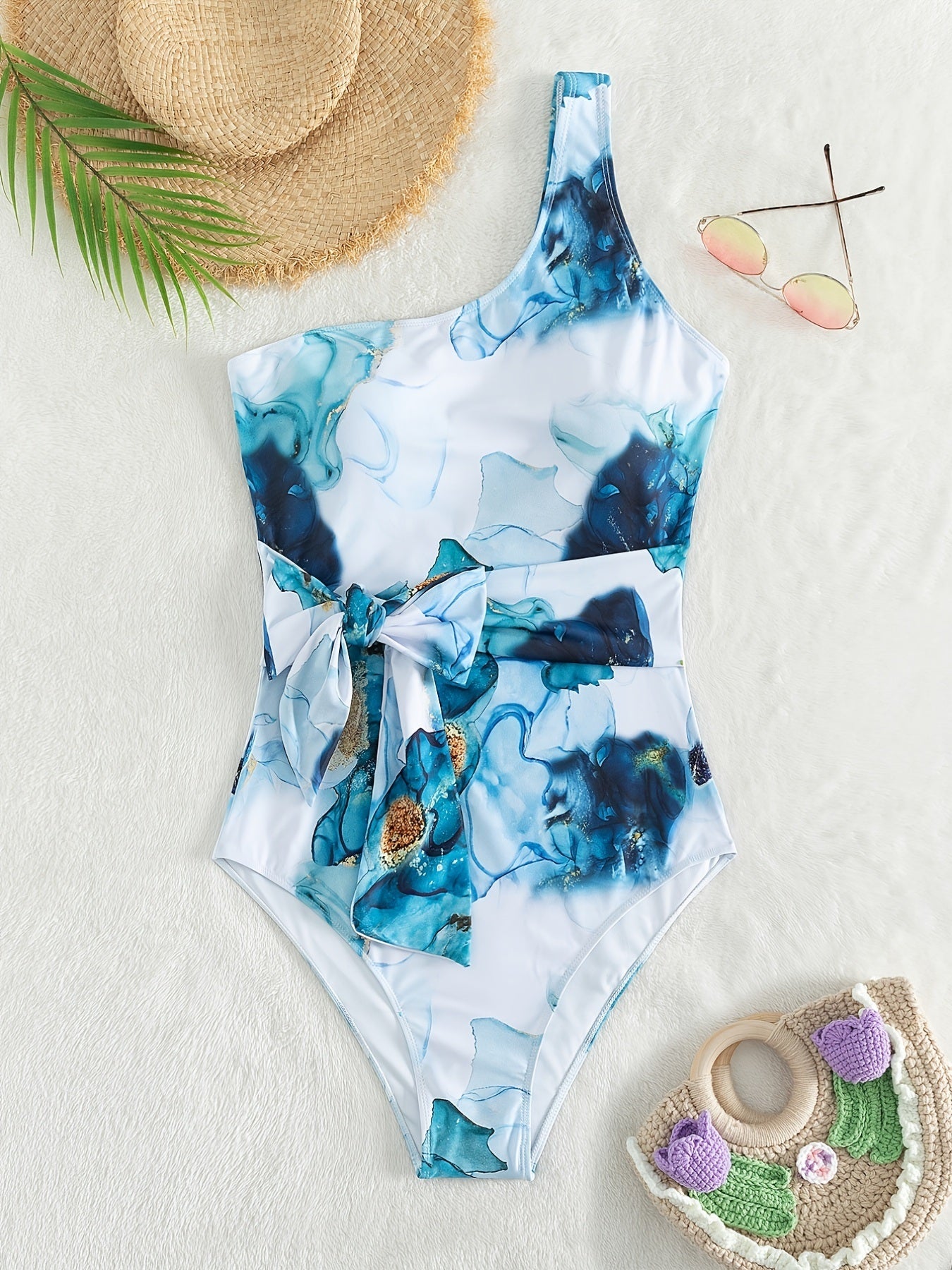 Plus Size Tie Dye Print Side Knot One Shoulder One Piece Swimsuit