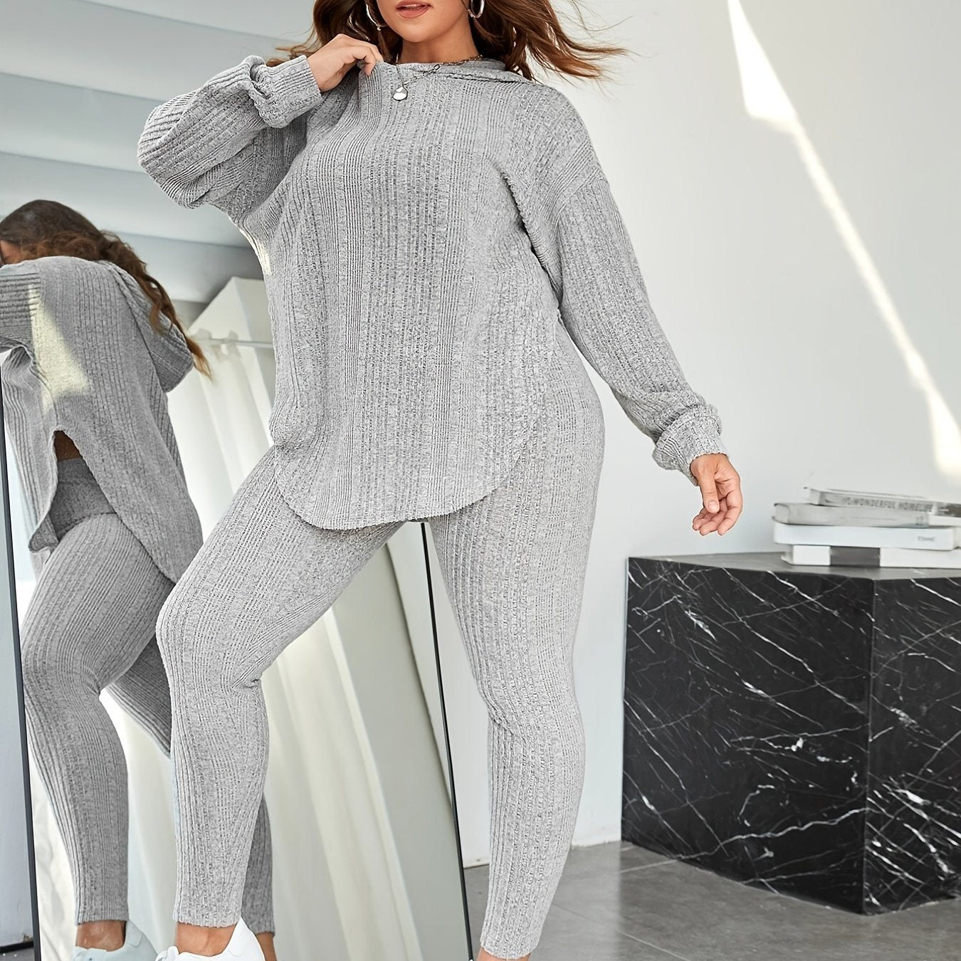 Rib Knit Solid Long Sleeve Hoodie Tops & Leggings Set