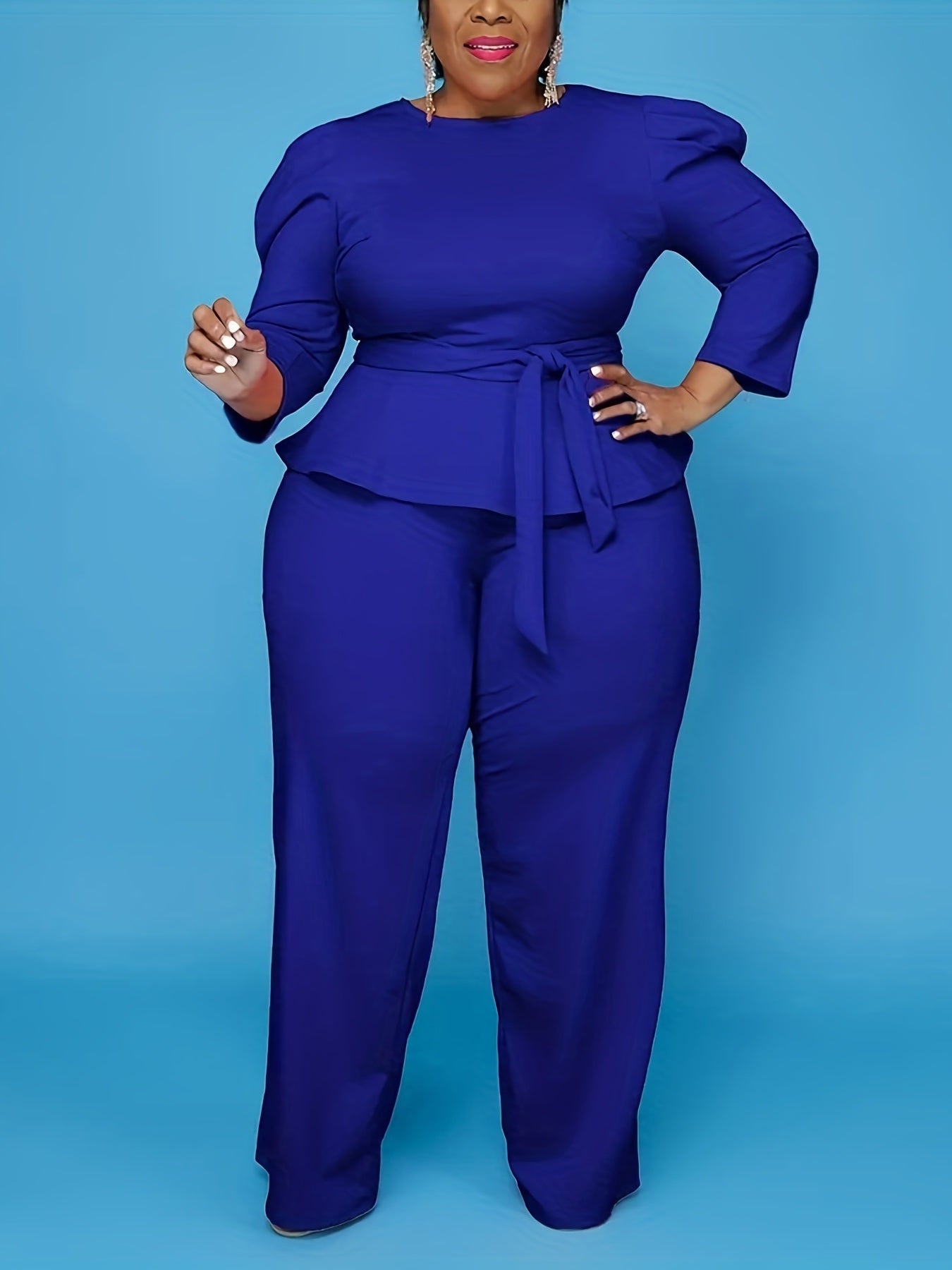 Women's Plus 3/4 Sleeve Peplum Zipper Tops Wide Leg Pant Outfits